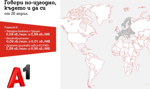 От края на месец април частните клиенти на мобилна услуга от A1 ще могат да се възползват от значително по-изгодни условия спрямо досегашните в страните от Западните Балкани – Албания, Босна и Херцеговина, Косово, Северна Македония, Сърбия и Черна Гора, и Турция. Новата цена на минута ще бъде 0,59 лева или 91% по-ниска от предходната цена за изходяща минута, а за мегабайт мобилен интернет цената ще стане 0,99 лева или почти 96% по-ниска спрямо настоящата тарифа за страни извън ЕС.