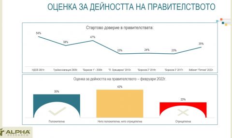 Два месеца след избора на новото българско правителство и непосредствено преди първия му сериозен тест с приемането на Закона за държавния бюджет, управляващите са изправени пред решаващи за тях дни що се отнася до посоката, която ще поеме обществената подкрепа и респективно, кредита на доверие към новата власт. „Алфа Рисърч“ са направили проучване в периода 6 – 14 февруари 2022г., сред 1060 пълнолетни граждани от цялата страна, чрез пряко стандартизирано интервю с таблети. Използвана е двустепенна стратифицирана по регион и тип населено място извадка с квота по пол, възраст, образование. Публикувано е на сайта на агенцията и се реализира със собствени средства.