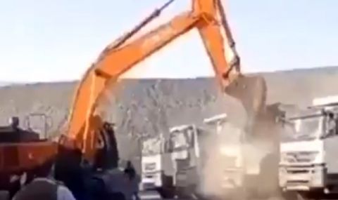 Краткото клипче показва как багер последователно смазва кабините на камиони, паркирани наблизо. Очевидци се опитват да спрат шофьора – някои от тях дори успяват да се качат на багера.