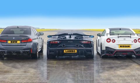 В поредното видео на колегите ни от CarWow, Мат Уотсън изправя един срещу друг Nissan GT-R в най-наточената му Nismo версия, Lamborghini Aventador в изпълнение SVj, както и най-върховото BMW M5 CS. Може ли практичният седан да се опълчи срещу двата суперавтомобила в състезание от място, доускорение от 80км/ч и тест на спирачките, може да видите във видеото под текста.