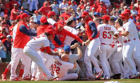 Всички играчи от двата тима се втурнаха към точката на конфликта, а дори в един момент се стигна и до хватки от борбата, за да бъдат разтървавани бейзболистите.