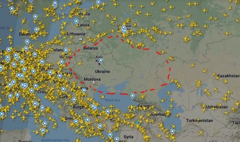 От сайта flightradar24 е видно, че полети на граждански самолети не се реализират почти до московска област. Целият периметър от там до Украйна на запад, Казахстан на изток и Грузия на юг е затворен.