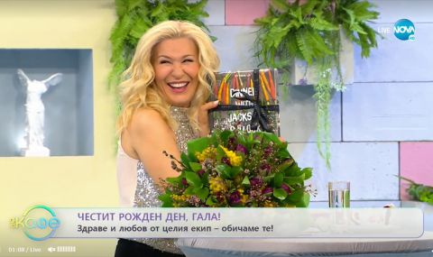 В събирането на сумата се включили и двете синоптички, които липсват като ководещи, заради скорошното раждане-Малкоданска и Никол Станкулова. Гала бе ослепителна в череп панталон и блестящ потник. Още в 9.30 тя почерпи със шампанско колегите си. В разговор с фенове преди седмица Гала призна, че не прави торта за личния си празник. В събота вечер преди рождения си ден тя се включи на живо в разговор с фенове в Instagram в компанията на дъщеря си.