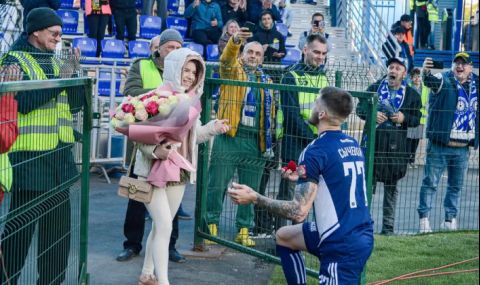 Нападателят на Оренбург взе букет и пръстен, които даде на приятелката си и ѝ предложи брак. Футболистът чу заветното „да“, a публиката започна да ръкопляска.