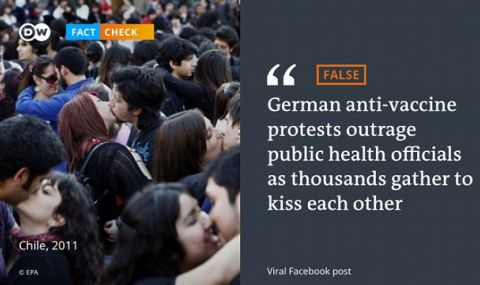 „Германски противници на ваксините провокират здравните власти с протести, на които хиляди хора се целуват“ – това заглавие, приписвано на английската редакция на Дойче Веле, бе публикувано във Фейсбук заедно със снимка от т.нар. протест. Проведена от нас проверка на фактите показа, че в това съобщение няма нищо вярно.