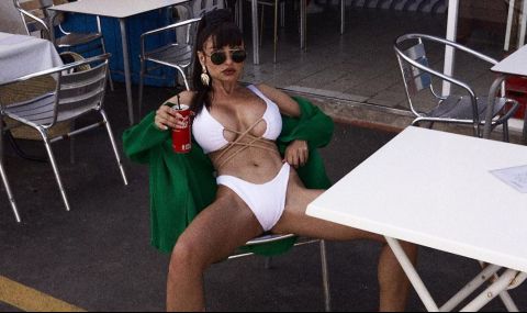 Едрогърдата рускиня реши да се покаже на своите последователи в социалните мрежи с кенче в ръка, бял бански и зелен халат, въпреки че лятото привидно си отиде още преди няколко месеца.
