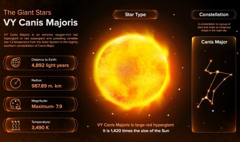 Самата звезда е масивна, с размери от 10 AU до 15 AU (астрономически единици). В този си вид тя се намира само на 4892 светлинни години от Земята. Това прави VY Canis Majoris, която се намира в южното съзвездие Canis Major, интригуваща за наблюдателите ѝ.