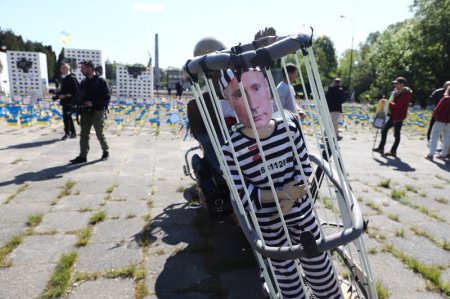 Басейн с фалшива кръв, разположен под кръстовете, носеше посланието на протеста, който бе организиран от гражданската инициатива „Евромайдан-Варшава“, която подкрепя Украйна.