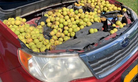 Хубавото в случая е, че ЛаФорс е решила да отвори капака на Subaru-то след ваканцията си, защото ако не го бе направила и се беше опитала да запали кросоувъра, стотиците орехи можеха да причинят доста щети по двигателя.
