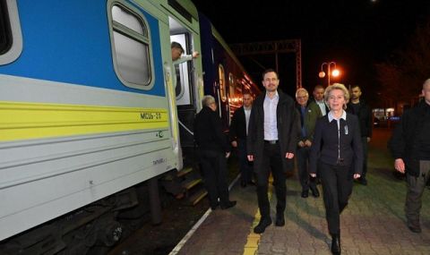 „С нетърпение очаквам да пристигна в Киев“, написа Фон дер Лайен в Туитър, придружавайки съобщението си със своя снимка с Борел и словашкия премиер Едуард Хегер, на перон на гарата до влак в цветовете на Украйна. „Отивам в Киев“, посочи шефът на европейската дипломация в туит, придружен със снимка, на която се вижда как върви до Фон дер Лайен и други служители.