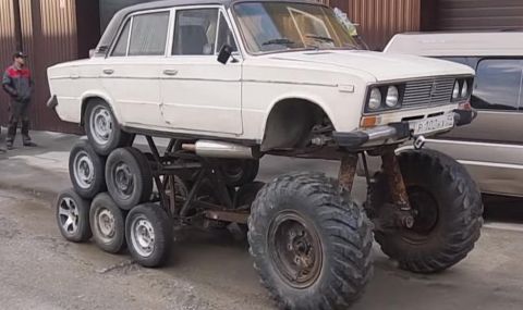 Седанът получава по шест колела от всяка страна на задната ос, а на предната се монтират 42-цолови колела от ГАЗ-66. Вижте повече за най-грозния и страннен експеримент с Lada.