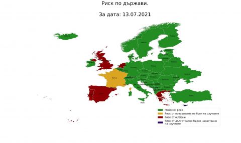 Веднага да отбележа, че оценката на риска я правим по наша си методология, която обаче доказа, че работи в последната година и половина. Страните в червено са под властта на делта варианта на вируса. Имаше въпроси за Гърция и Турция. Виждате цветовете. В Гърция нещата са изтървани въпреки мерките. Ходете, но внимавайте, спазвайте каквито мерки има там. В Турция нещата са спокойни и до края на седмицата там проблеми не се очакват.