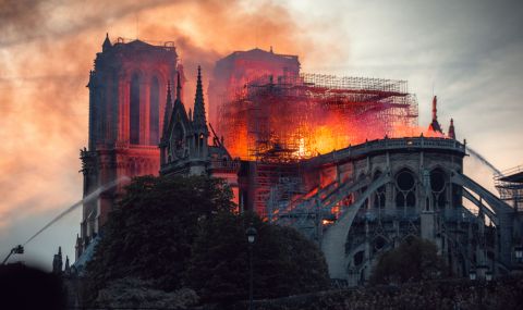 Вечерта на 15 април 2019 г., по време на строителни дейности при мащабна реставрация, избухна голям пожар, който обхвана целия покрив и шпила. Пожарът горя около 15 часа и унищожи целия покрив, но пожарникарите спасиха двете кули на фасадата. Заради реставрацията голяма част от експонатите са били изнесени и така не са пострадали.
