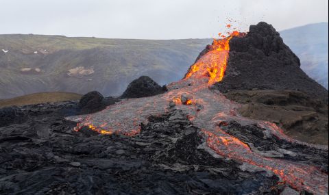 Любопитни хора се стичат към мястото на изригването, за да усетят тътена на земята под краката си, докато от дълбините бликат фонтани от лава.