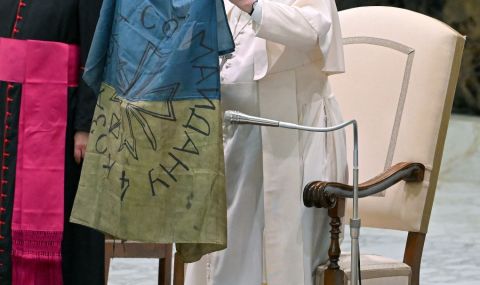 Папа Франциск днес осъди „клането в Буча“, докато държеше в ръцете си украинско знаме, изпратено му от града, в който бяха открити застреляни от упор тела с вързани ръце, масов гроб и други следи от екзекуции, предаде Ройтерс.