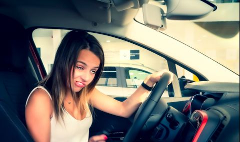 Пасажерът в автомобила – друга жена – е прехвърлила крака си през скоростния лост, за да може да натиска педала на автомобила. С лявата си ръка шофира, а с дясната снима.