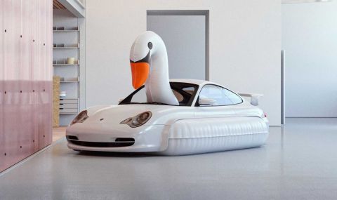Снежно бялото Porsche 911 е получило излизаща през предния прозорец глава, а в страничната част гумите и вратите са покрити с материал, който имитира прибраните крила на лебеда.