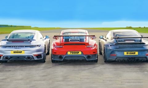 Пореден епизод на CarWow ни представя няколко подобни модела с различна мощност, различно тегло и различни задвижващи колела. В тестовете за старт от място, доускорение от 80км/ч и тест на спирачките днес се изправят Porsche 911 992 Turbo S, 911 992 GT3 и върховото 911 GT2 RS от поколение 991. Те ще ни покажат дали по-мощната кола със задно предаване може да се мери с по-„слаба“ кола, но със задвижване на четирите колела или пък балансът между тегло и конски сили е най-важен в конкретните дисциплини.