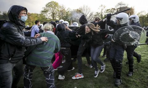 Докато снощи траеше пресконференцията на премиера Марк Рюте, на която той обяви новите ограничения, около 200 души излязоха пред правителствени сградив Хага, замервайки с камъни полицията.