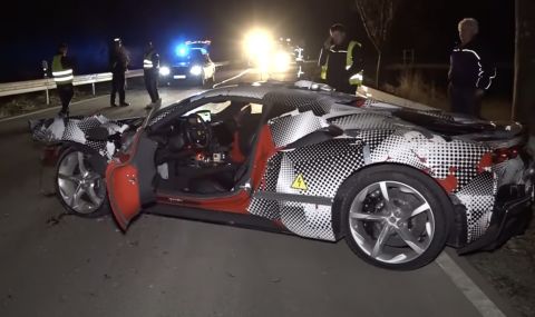 Тестов прототип на Ferrari в купето на SF90 Stradale претърпя тежък инцидент този уикенд в Германия. Покритият с камуфлаж суперкар се е ударил в мантинела и се е завъртял няколко пъти, преди да спре в средата на платното.