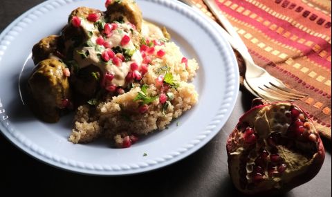 Успоредно с това в друга тенджера сложете да заври вода с глава лук, скилидка чесън, щипка сол и киноата. Гответе на умерен огън, докато киноата не набъбне. След това я отцедете и я оставете да се хлади. През това време пасирайте картофите, след което към тях добавете киноата и подправете на вкус.