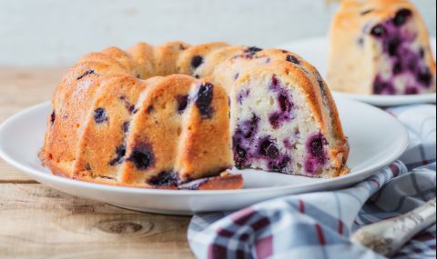 4. Вече на по-ниска скорост добавете сухата смес от брашно, а след него и половината от боровинките.