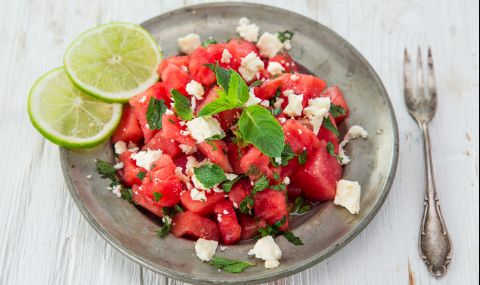 Доматите също нарязвате на кубчета. Избирате хубаво, добре узряло сирене. Сиренето също нарязвате на кубчета. В купа или голяма чиния изсипвате нарязаните диня, домати и сирене.