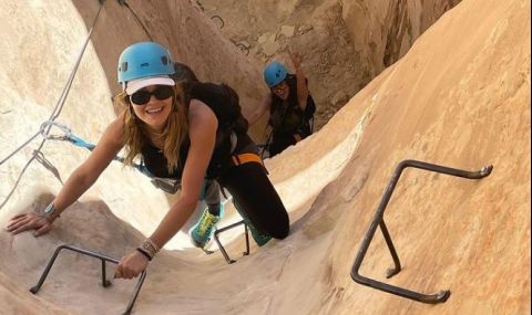 Певицата този път се е отдала на малко скално катерене с приятели. Както подобава те са екипирани прилежно, за да не позволяват на някоя глупава случайност да им коства нещо повече от жарка умора.
