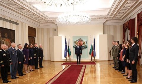 Държавният глава и върховен главнокомандващ на Въоръжените сили Румен Радев удостои български военнослужещи с висше офицерско звание на церемония в Гербовата зала на „Дондуков“ 2.