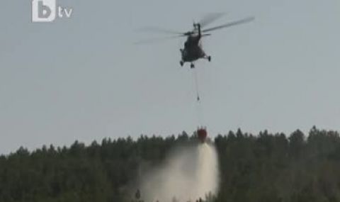 За втори ден продължаващият да бушува огън в гората се атакува от въздуха с хеликоптери.