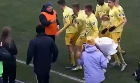 Футболистът на беларуския Сморгон – Владислав Шубович предложи брак на дългогодишната си приятелка по време на дербито с Волна Пинск.