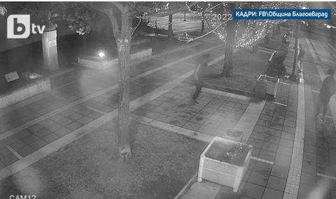 Камери на общината в Благоевград са заснели как група младежи се опитват да потрошат коледната украса в центъра на града, съобщи bTV.