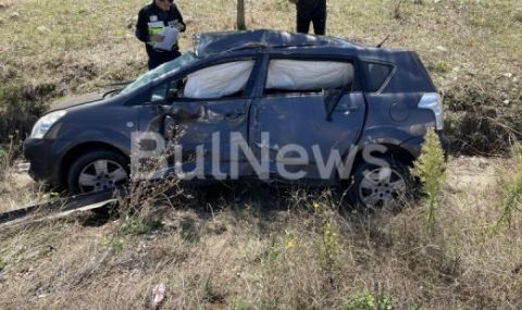 Вследствие на силния удар колата е изхвърчала край пътя. Материалните щети по японското возило са сериозни, като то е напълно размазано.