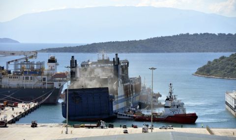 Досега от кораба, който в момента се намира на пристанище Астакос, са извлечени обгорелите тир-ове, които щателно се проверяват от екипи на пожарната и експерти, назначени от прокуратурата в Корфу и Месолонги.