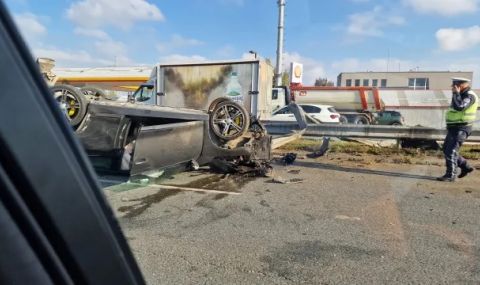 По първоначална информация лека кола се е ударила в мантинелата между двете платна, навлязла е в насрещното платно и се е обърнала по таван.
